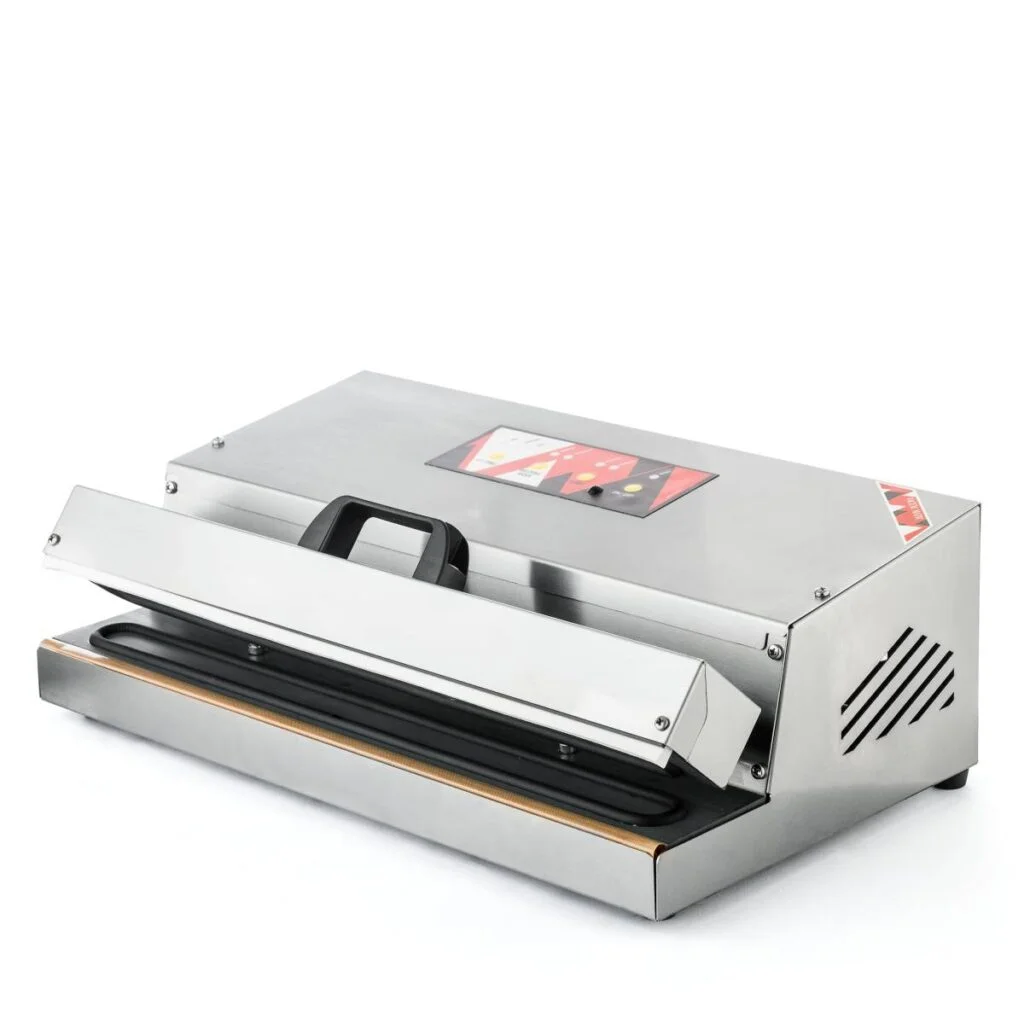 VACUM MATIC 43 INOX se ponaša z izjemno široko varilno letvijo, ki meri kar 430 mm. Ta širina omogoča pakiranje izjemno velikih kosov mesa, cele ribe ali večjega števila manjših vrečk hkrati, s čimer se drastično poveča dnevna učinkovitost pakiranja.